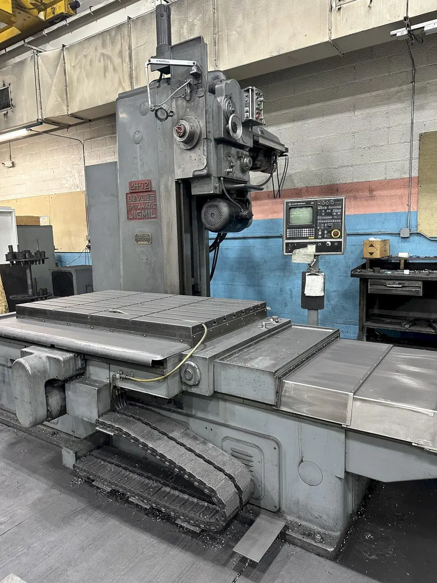 Used 1980 DeVlieg 4" 4H72 CNC Jig Mill. Equipped with Allen Bradley 8200 control, 25 hp power, and 1,000 RPM. Features include a 60"x40" table, 60" vertical travel, and compact dimensions. Ideal for precision milling needs.